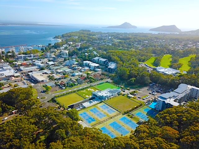 Nelson Bay Tennis has 8 synthetic courts available for hire. We are located at 61 Dowling Street, Nelson Bay, right at the top of town above the Nelson Bay Bowling Club. From the courts there are extensive views of the Bluewater Wonderland of Port Stephens.